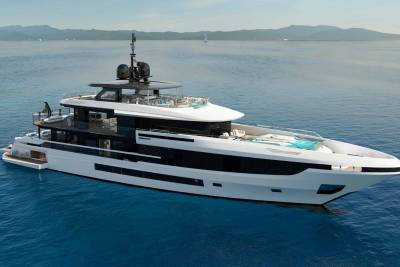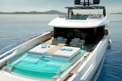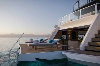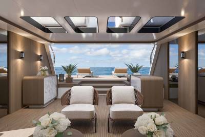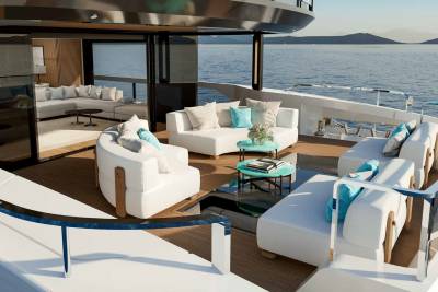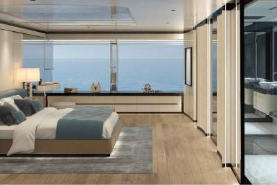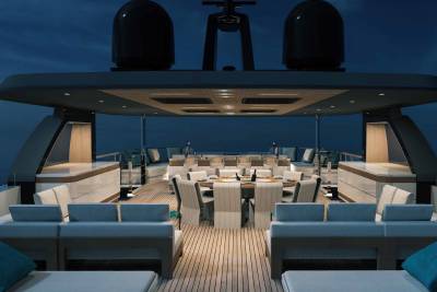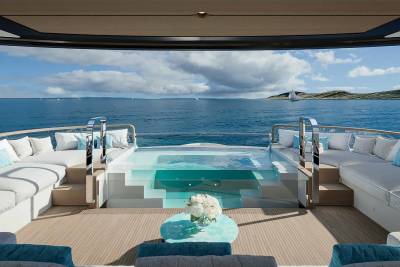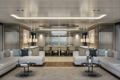 Her exterior design focuses on space and connection to the sea. A vast beach club opens directly onto the water, while generous aft decks and a large pool create relaxed social areas designed for long days at anchor. Wide windows and open terraces blur the line between interior and exterior, filling the yacht with light and sea views.