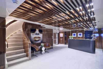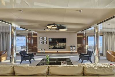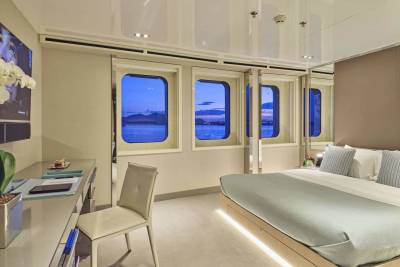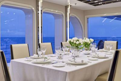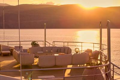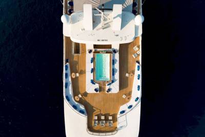 Forget squeezing onto a shared sunbed on a single cosy aft deck, Marquiseboasts more outdoor space than all 28 guests will know what to do with. A generous swimming pool takes centre stage on the sun deck, positioned to provide a vantage point from all sides. Encircled by sunpads and flanked by a further two banks of sunbeds, it forms a sun worshipper’s delight. Armchair seating forward and an open-air lounge area of dreams aft heralds starlit socialising.