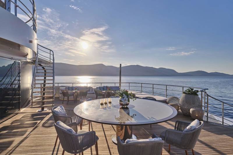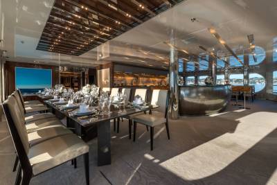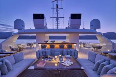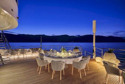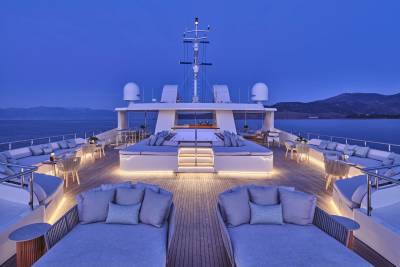 Marquise’s outdoor spaces come into their own when at anchor. Capable of hosting up to 100 guests for quayside event charters and corporate entertainment, the yacht creates a floating island with top tier amenities that will rival any shoreside setup, night or day.