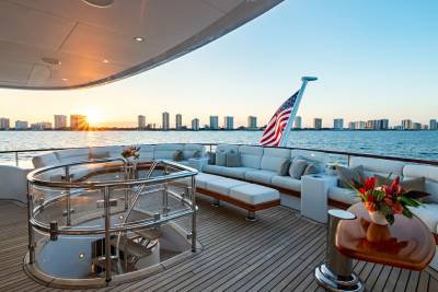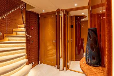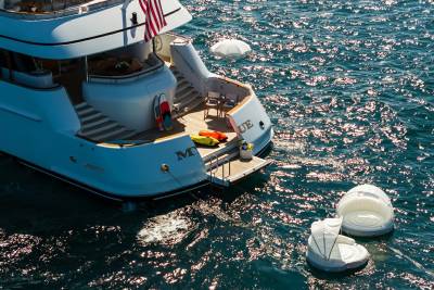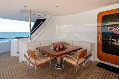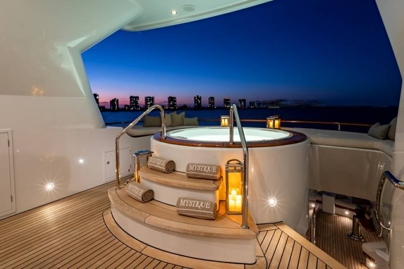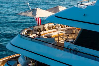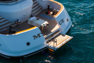 Deck spaces are arranged for entertaining and relaxation. The cockpit integrates a hydraulically operated swim platform and passerelle, while the flybridge offers a raised jacuzzi, captain’s chairs and sun loungers. Every area is designed to feel purposeful and usable underway or at anchor.