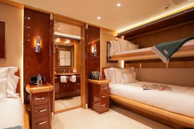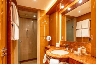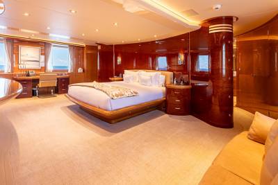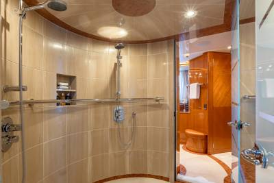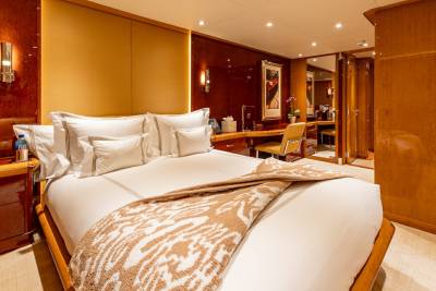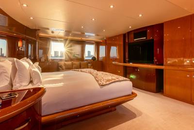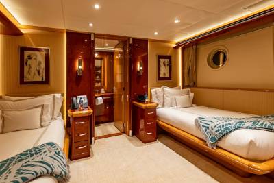Mystique accommodates up to 12 guests across five well-appointed cabins. The full-beam Owner’s suite sits forward on the main deck with a king bed and generous proportions. Below deck, a VIP queen cabin and additional guest cabins provide flexible accommodation for family or guests, all finished to a high standard.