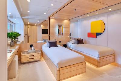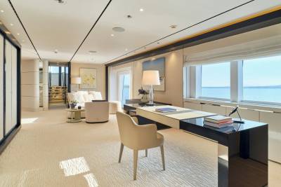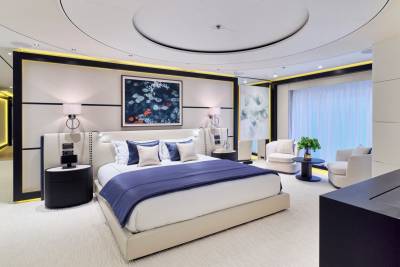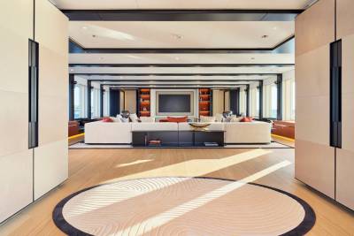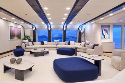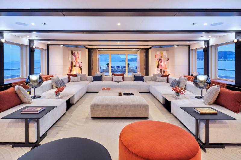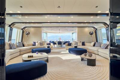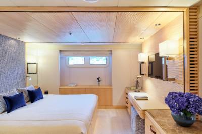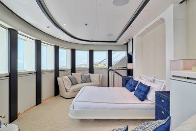 The main salon of Ora exudes elegance with rich mahogany and amber tones, while oversized windows provide breathtaking views. The C-shaped sofa fosters lively conversations, and the skylounge offers a fresh and vibrant atmosphere with a white and blue color scheme. With a circular seating arrangement and separate dining area, Ora offers a versatile space for intimate conversations and meals, catering to charter guests’ various preferences.