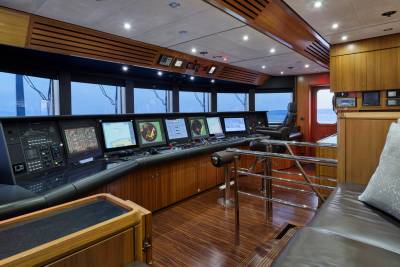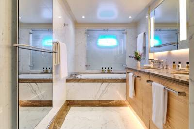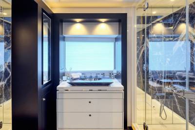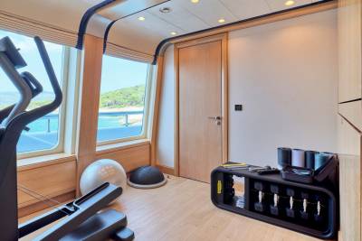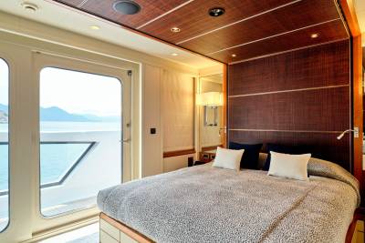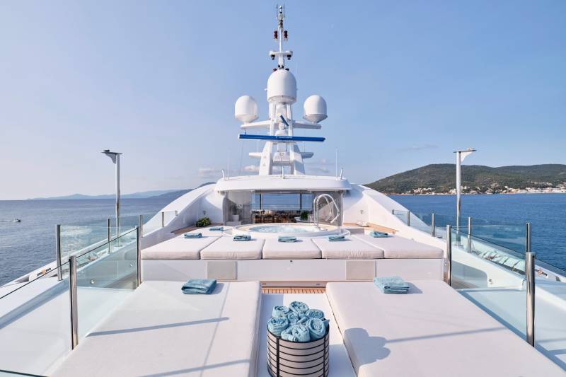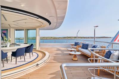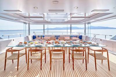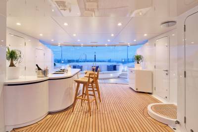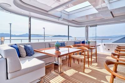 Ora's sundeck offers a serene retreat for charter guests, providing panoramic 360-degree views. Relax and unwind in the Jacuzzi while enjoying the breathtaking surroundings. Her sun deck also includes a dedicated bar and barbecue corner, which sets the stage for lively parties and social gatherings in an idyllic ambience. Embracing the outdoors in all weather conditions is effortless with the sliding glass panels, allowing guests to fully appreciate the expansive lounging area. Whether seeking tranquility or vibrant celebrations, Ora's sundeck offers a versatile and inviting space for guests to treasure every moment.
