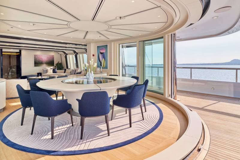 The main salon of Ora exudes elegance with rich mahogany and amber tones, while oversized windows provide breathtaking views. The C-shaped sofa fosters lively conversations, and the skylounge offers a fresh and vibrant atmosphere with a white and blue color scheme. With a circular seating arrangement and separate dining area, Ora offers a versatile space for intimate conversations and meals, catering to charter guests’ various preferences.