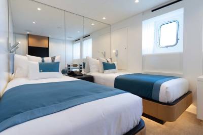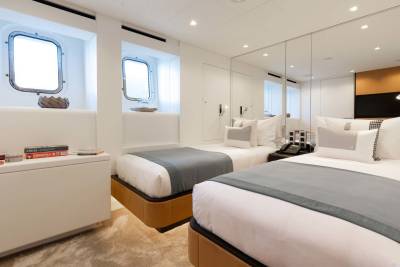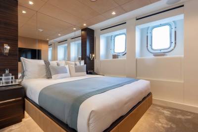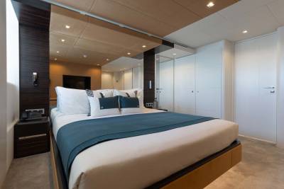 Orion presents six staterooms that accommodates up to 12 guests. With the Owner’s cabin situated on the main deck, a full beam VIP, and two double and two twin staterooms on the lower deck, she can be used for both charter and private use.