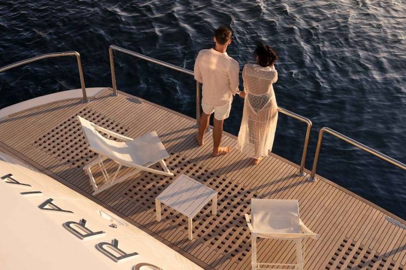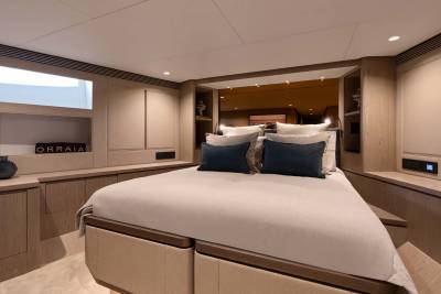 Orraia is set up for guests who want to make time for proper play. The beach club style swim platform becomes mission control, with snorkel sets, paddleboards and the tender all launching from the same easy access spot. The bridge deck jacuzzi offers a front row seat to the action for those who prefer to spectate with a drink in hand.