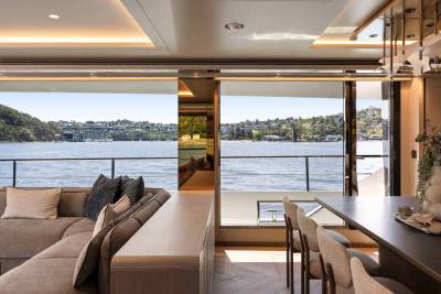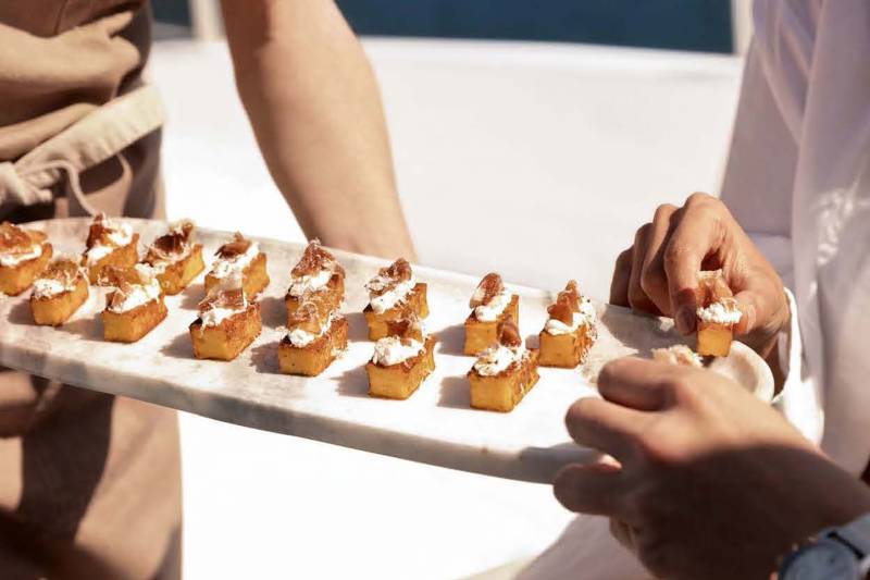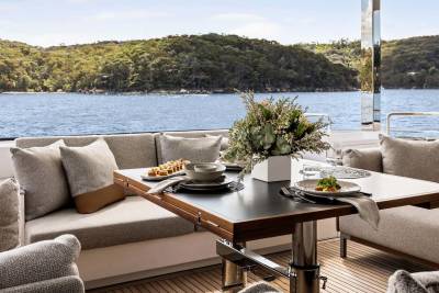 Chefs plate dishes built around reef fish, native herbs and bright, fresh flavours while guests drift between indoor comfort and the shaded aft terrace for long, easy lunches and slow conversation. As evening falls enjoy a five-course Australian fine dining menu designed by Justine Schofield.