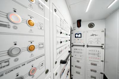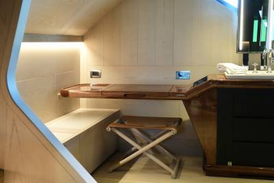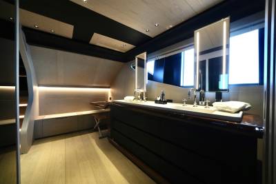 The principal cabin features an office area and direct access to the foredeck sunbathing area.