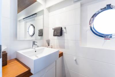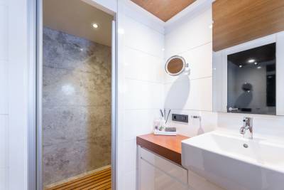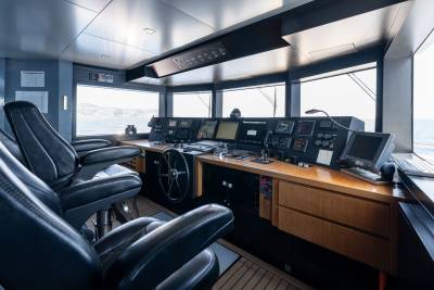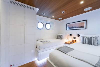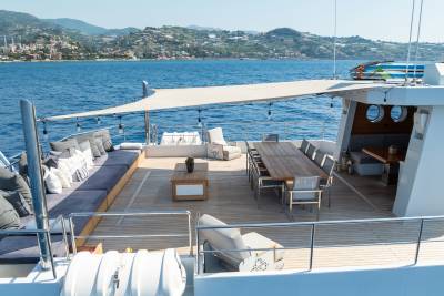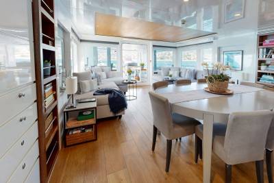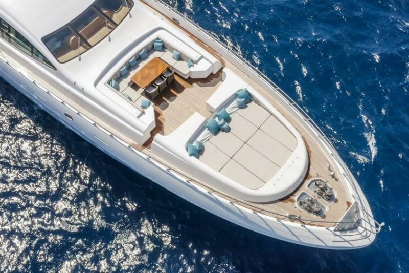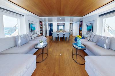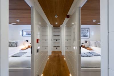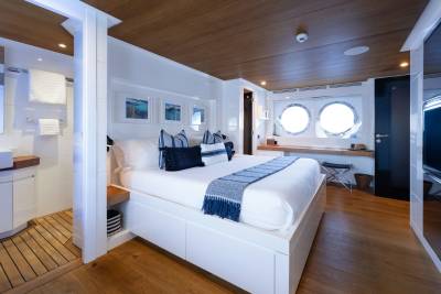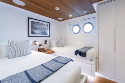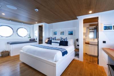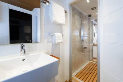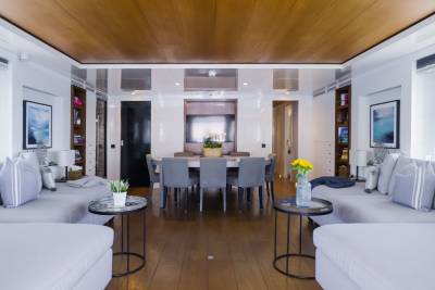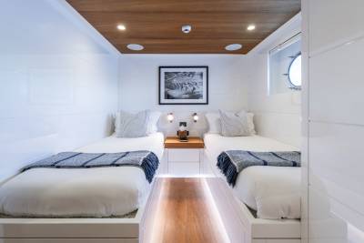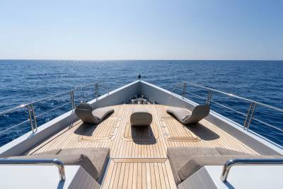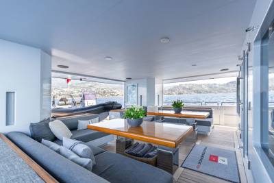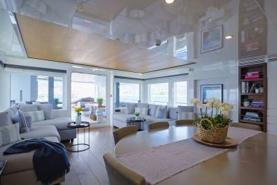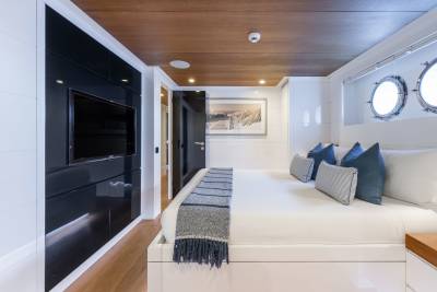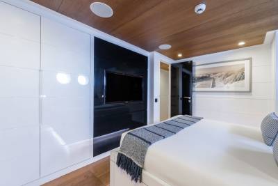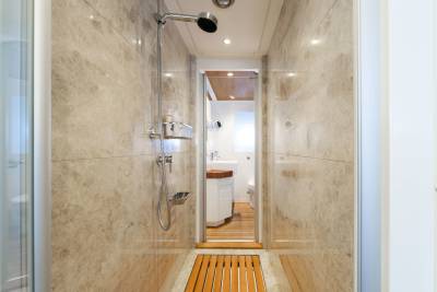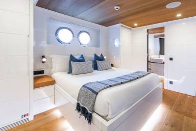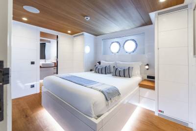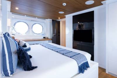 The layout is made for connection. The main salon opens wide to the aft deck for seamless indoor-outdoor living, while the full-beam Master on the main deck offers private sanctuary with his-and-hers bathrooms. Two VIPs and two twins below complete the five-cabin set-up — all ensuite, all light and contemporary.