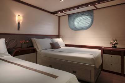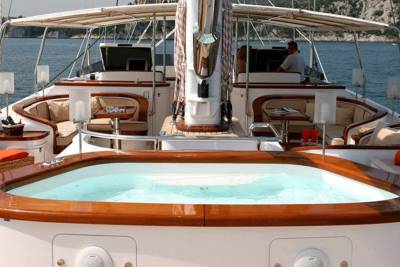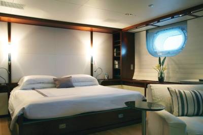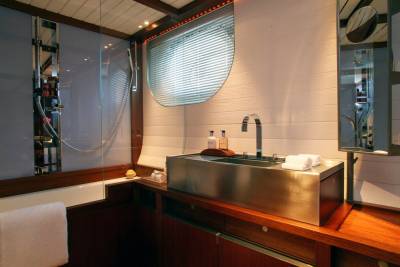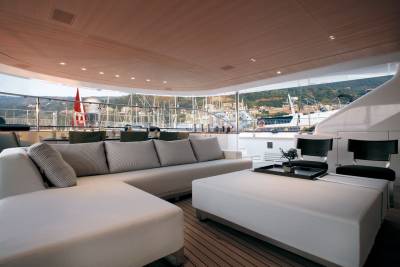Her sophisticated and understated interior, finished with Hermès touches, can accommodate up to 30 guests in her spacious main salon and sleeps 12 guests in seven beautifully appointed staterooms. Rosehearty offers endless hours of fun and various entertaining options with an abundance of deck space. Her unique cockpit layout provides a sheltered space for al fresco dining and is convertible to an outdoor cinema. She also boasts a Jacuzzi on the flybridge and a swim platform with access to her plethora of water toys will keep guests occupied at all times.