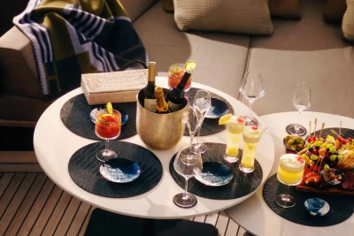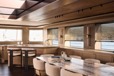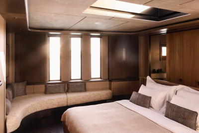 Seven comfortably hosts 10 guests in five double suites, including a full-beam master with warm, understated detailing. Her layout is generous, functional, and flows easily across decks. At anchor, the beach club opens up for afternoon dips and cocktails by the waterline.