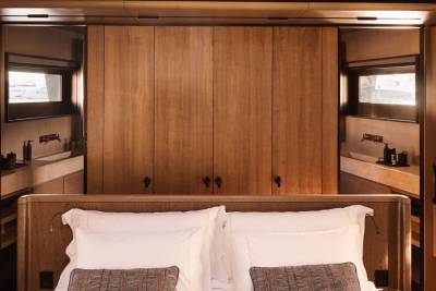 Natural finishes. Clean lines. No excess. Just five well-appointed cabins, including a full-beam master suite forward, three queen doubles, and one additional double – all with ensuite and elegant simplicity.