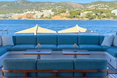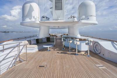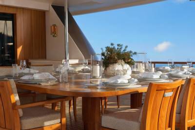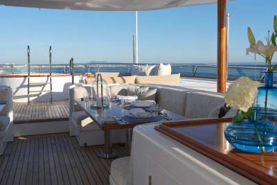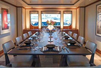 Solace carries a full fleet of electric boards, foil gear, diving and snorkelling kits, and towables – plus a custom jellyfish pool and a huge swim platform for basecamp-style fun. Her 12m chase tender opens access to adventures far from port.