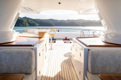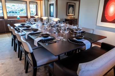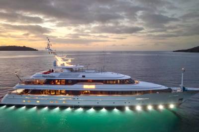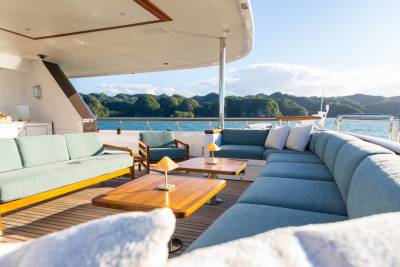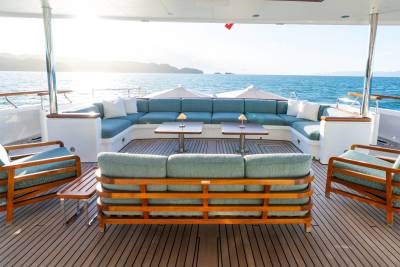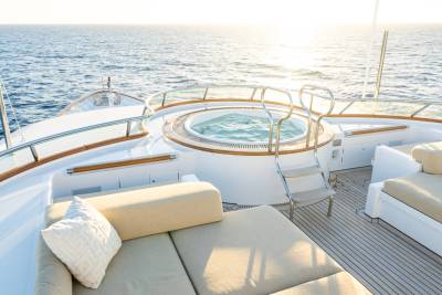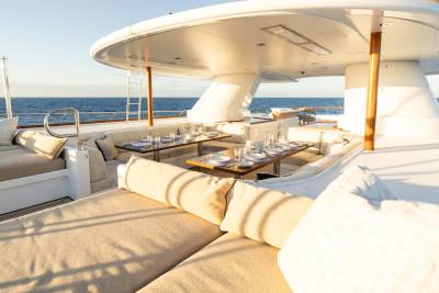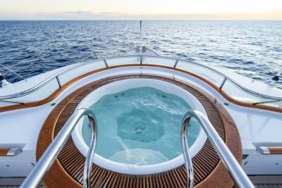 Solace carries a full fleet of electric boards, foil gear, diving and snorkelling kits, and towables – plus a custom jellyfish pool and a huge swim platform for basecamp-style fun. Her 12m chase tender opens access to adventures far from port.