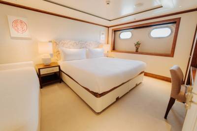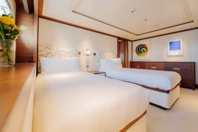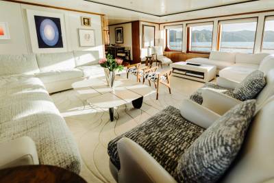 Designed by Vickers Studio, the interiors are warm and contemporary, perfect for families and private groups. Five guest suites welcome 12 guests, with two additional berths for guides or specialists. Her tender game? Unmatched – including a 12m Espen Øino-designed chase tender for remote landings and multi-day excursions.