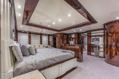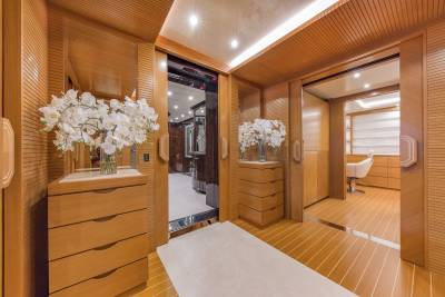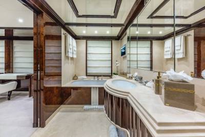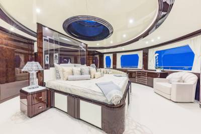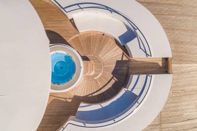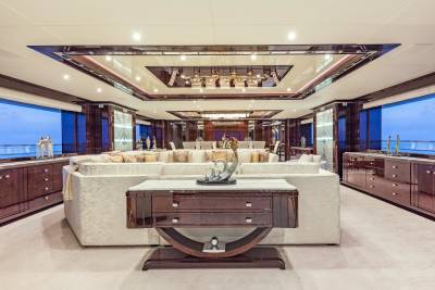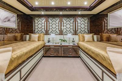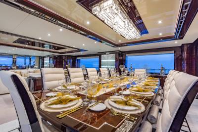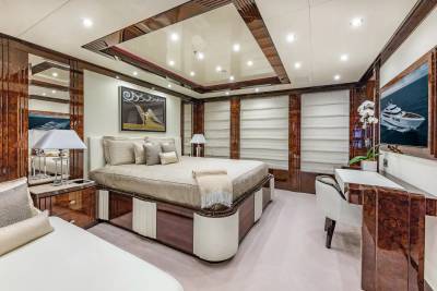 Spectre welcomes up to 12 guests in six beautifully designed cabins, featuring a full-beam master suite with panoramic views and a private spa pool. The five guest cabins blend modern art deco style with elegant finishes and ample natural light. A professional crew of 14 ensures exceptional service throughout the yacht.