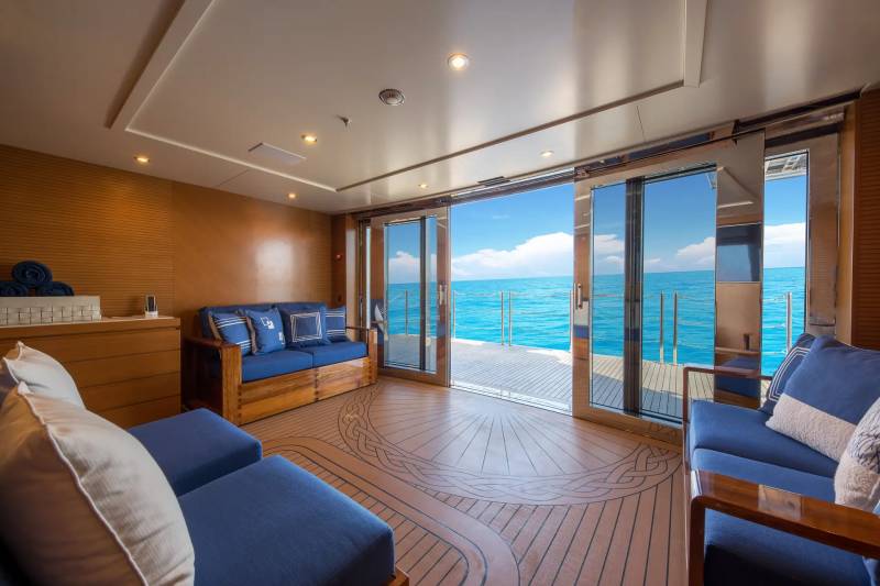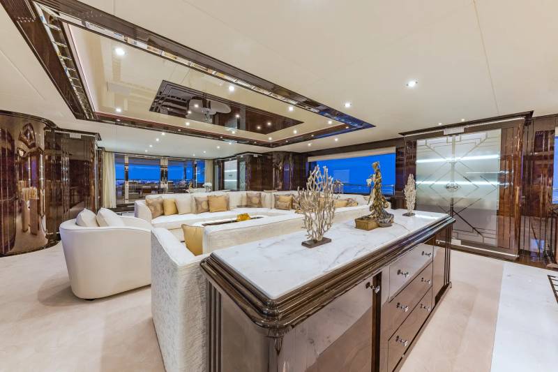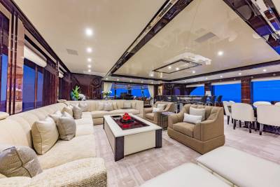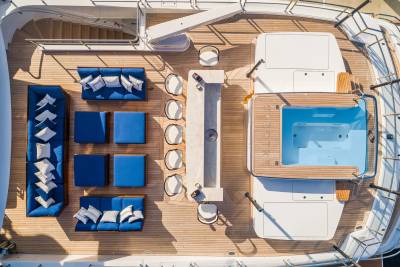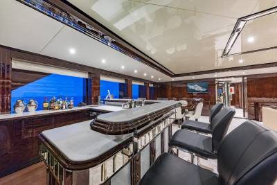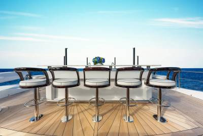 The carbon-fiber paperless bridge by Team Italia offers advanced navigation with foldable screens and a digital chart table. A guest lift provides smooth deck access. The owner’s deck includes an air-conditioned dining area and separate lounges, while the bridge deck boasts a bar next to a jet pool, plus dining with a grill and pizza oven.