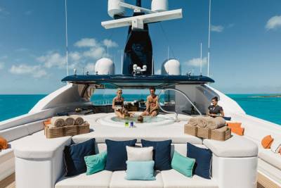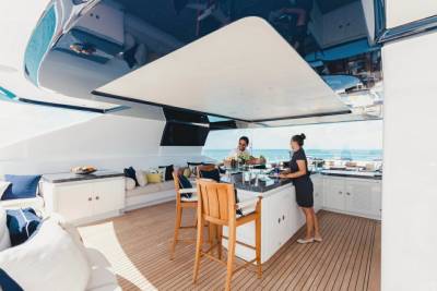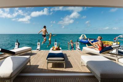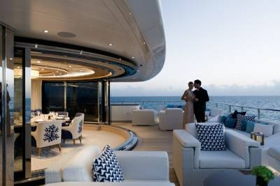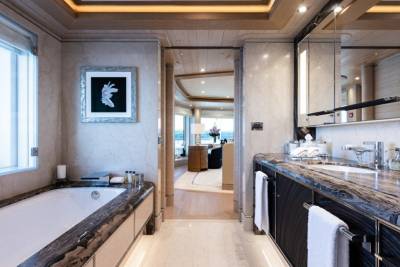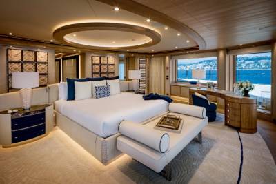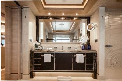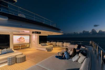 Starburst IV is an award-winner and it’s easy to see why. There’s no limit to the fun or luxury available on board, her five decks are packed with possibilities. From the large 10,000-litre swimming pool on the main deck, to the entertainment and lounging space on the foredeck, the yacht offers a variety of spaces for every occasion while the amenities list includes a spa with fold down balcony for massages on the water, indoor and outdoor cinemas, a private deck from the master suite, an onboard gym and an elevator.