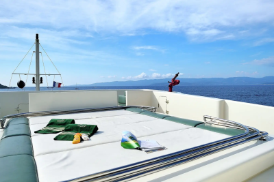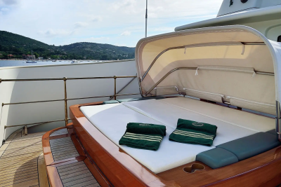 The spacious bridge deck offers ample space to relax enjoy the ride. She provides a mix of comfortable seating to soak up the rays or enjoy the sea breeze under a sheltered canopy, the best spot for alfresco dining. A large, heated spa pool sits on the bridge deck aft. The perfect spot for views from sunrise to sunset.