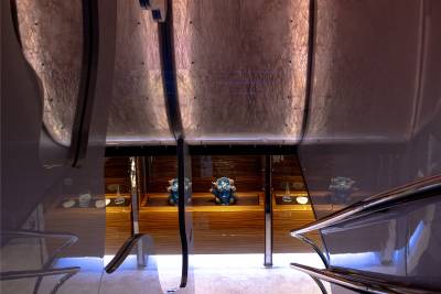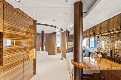 Designed by the renowned Francesco Paszkowski, Tiamat's interior exudes modern luxury, combining the richness of Zebrano wood, Forest Brown marble and intricately woven leather. Expansive windows flood the main saloon with natural light, while a sophisticated mix of LED and fibre optic lighting creates a captivating nighttime ambience.