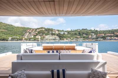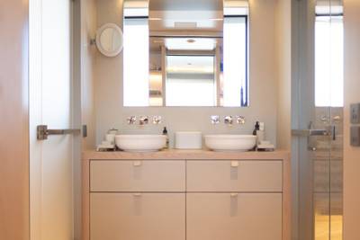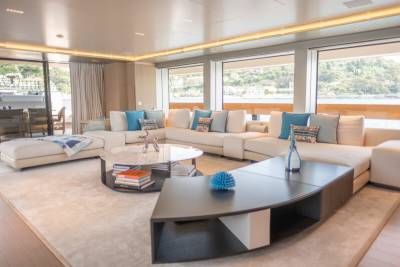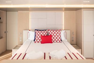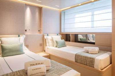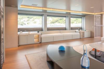 Six ensuite staterooms sleep 12 guests comfortably. The full-deck owner’s suite includes a king bed, private studio and lounge. Two VIPs, two convertible twins and a children’s cabin complete the layout. Crew quarters for nine ensure service is discreet but ever-present.