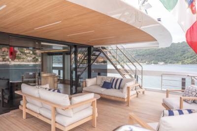 The aft-deck infinity pool invites guests close to the water. Sunbeds, shaded tables, informal lounging—today’s pace, your style.