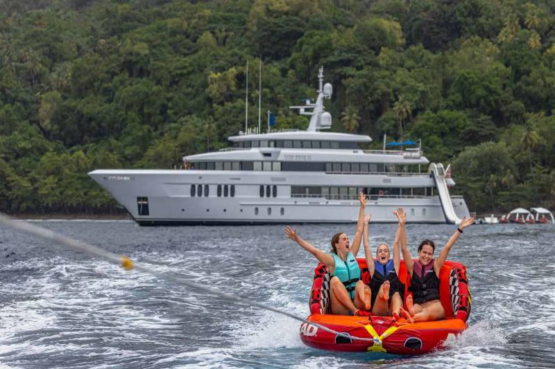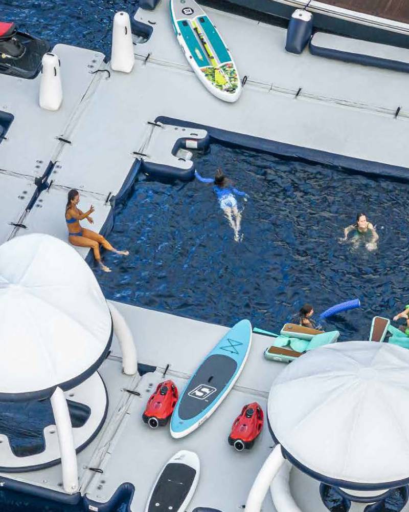 Top Five II carries a wide mix of toys for everything from high‑energy runs to relaxed exploring. Jet skis, e‑foils and wake gear set a fast rhythm, while kayaks, paddleboards and towables create space for all ages to join in. Simple beach‑club launching keeps the day’s flow easy and flexible.