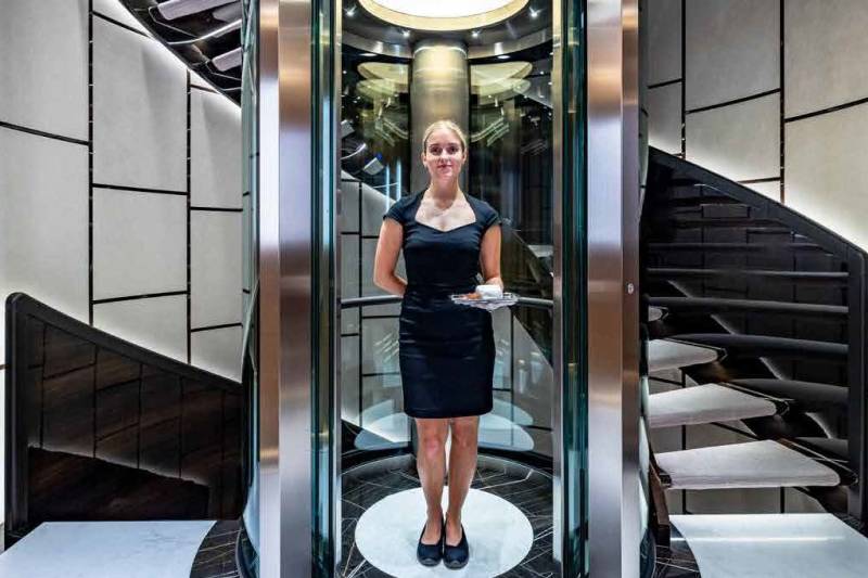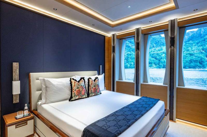 Her main salon immerses you in an ambiance of refined luxury and timeless sophistication. A chic foyer with a bar and floor-to-ceiling windows flood the space with natural light and sweeping ocean views. Thoughtfully divided into distinct yet harmonious areas, the salon features an inviting lounge with plush sofas and armchairs, as well as a formal dining area centered around a bespoke 4.1-meter table for 14 guests. The contemporary-classic American design exudes opulence with a palette of bronze, silver, and rich wood tones creating a setting that is as luxurious as it is welcoming.