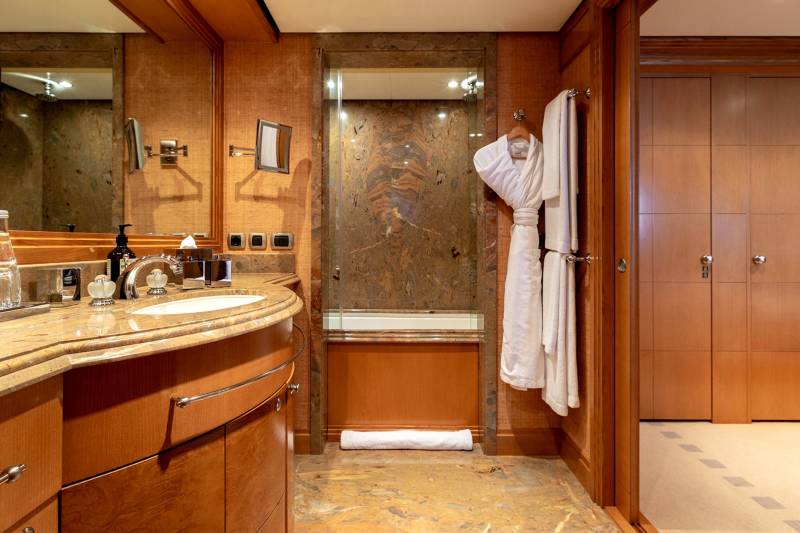Treehouse accommodates 12 guests across six cabins, all designed to offer genuine space and comfort. The full-beam principal suite on the main deck is a highlight, featuring a king-size bed, expansive spa bathroom with his-and-hers facilities and excellent separation from guest traffic — ideal for owners or principal charterers seeking privacy.