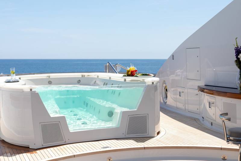 At over 30 metres long, the sun deck is a destination in its own right. An oversized Jacuzzi anchors the space, surrounded by deep lounging, sun pads and a generous bar. A foam machine, nightclub lighting and DJ-style setup allow the mood to shift effortlessly from laid-back afternoons to high-energy evenings, while still offering quieter corners for guests who prefer to relax away from the action.