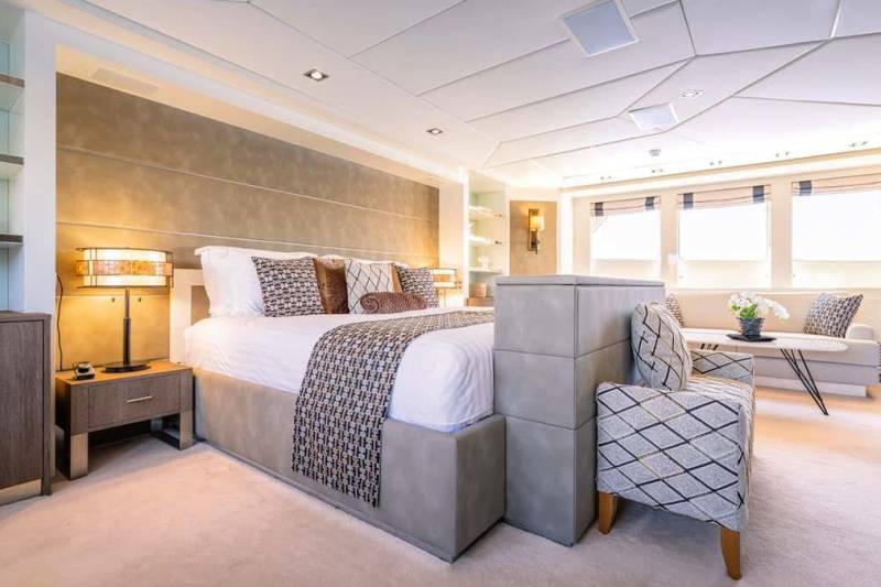 Victory’s accommodation is freshly updated and intelligently laid out. The full‑beam principal suite sits forward on the main deck with a private office, walk‑in wardrobes and a marble ensuite featuring his‑and‑hers basins and a jacuzzi tub. A discreet entrance serves the aft VIP, while the lower deck offers two queen staterooms and two twin cabins, all with ensuite bathrooms. Calm palettes, soft textures and thoughtful storage ensure everyone settles in quickly.