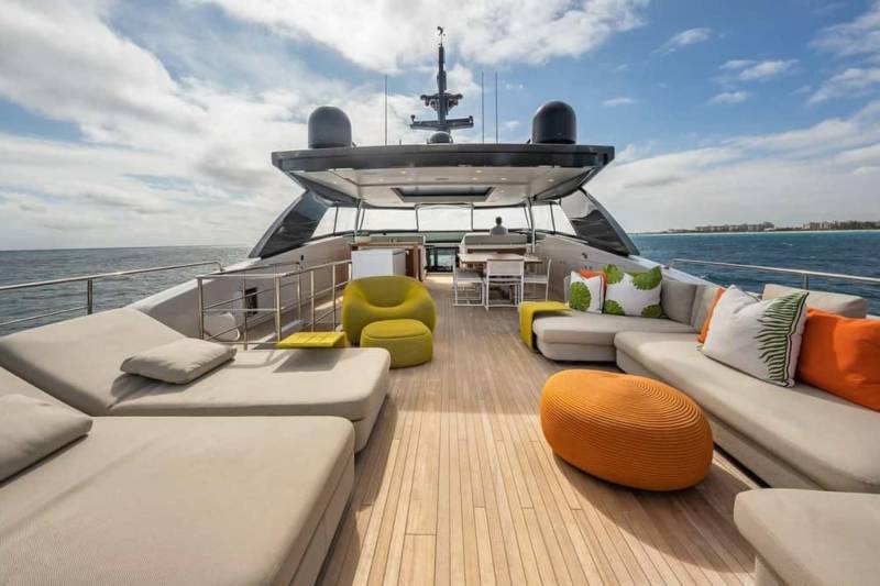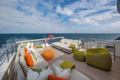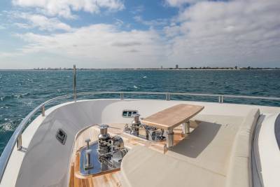 The sundeck is built for long, lazy days and lively evenings. A bar, dining table, generous sun loungers and an electric hardtop allow guests to shape the space to the moment. Whether shaded lunches or sunset drinks, it adapts effortlessly and never feels crowded.