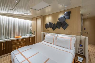 Wombat accommodates 11 guests across five well-balanced cabins. The main-deck owner’s suite features a king bed, private office and dressing area with panoramic forward views. Below deck, there are three double cabins with queen beds and one twin cabin with two singles plus a Pullman, offering flexibility for families and mixed groups.
